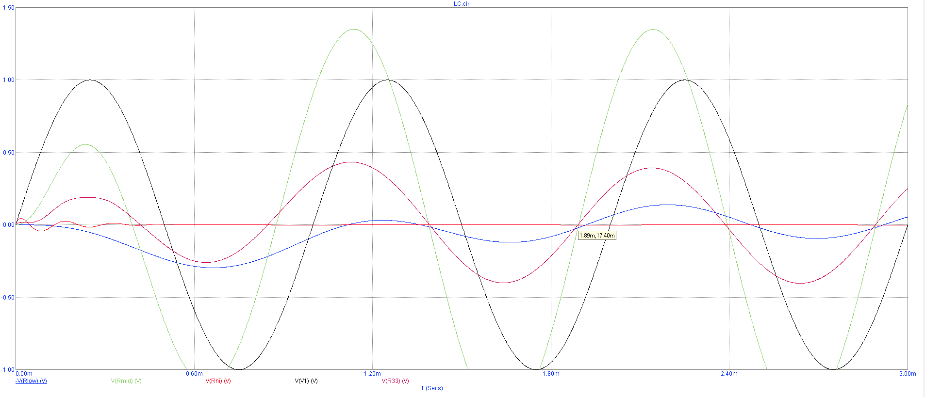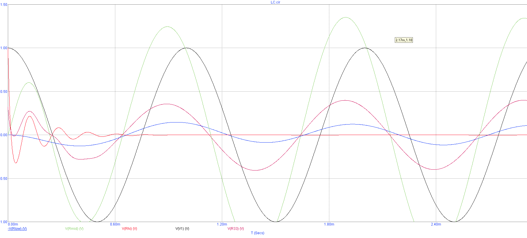 Вот берём схему и номиналы пассивного фильтра с паспорта АС. Подаём на этот фильтр синус 1кГц и смотрим что делается на выходах фильтра. В первый период колебаний мы видим переходной процесс.