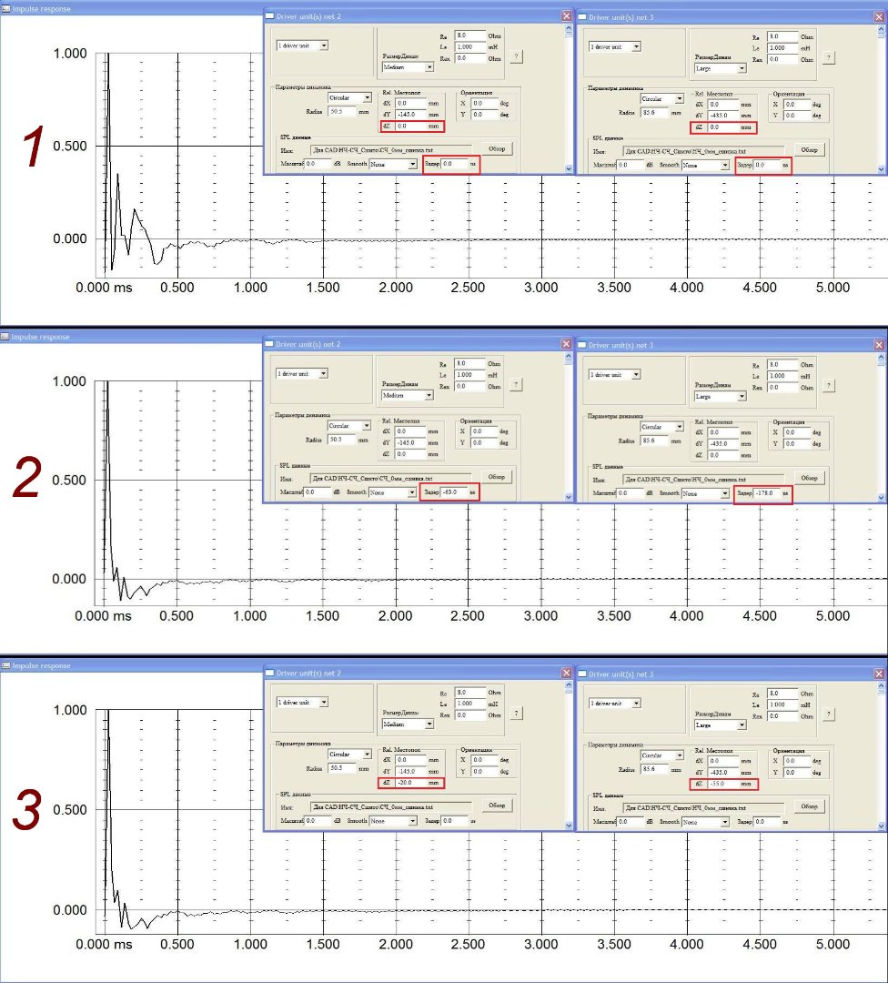 2. Введены задержки (в мкС) для ВЧ и СЧ относительно НЧ. Т.к. в ВЧ все координаты нулевые, то для визуального удобства задержки введены в СЧ и НЧ (со знаком - ) относительно ВЧ. CAD допускает и отрицательные задержки. Разницы не будет.