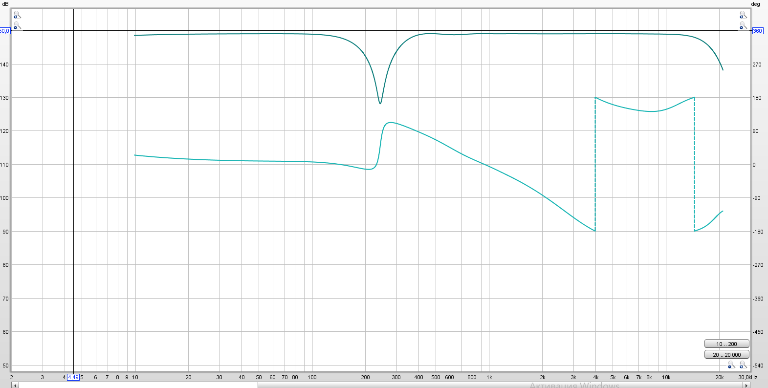 получим такое АЧХ практически та же (немного опустились НЧ), но клятая межполосная фаза разъехалась в обоих полосах.