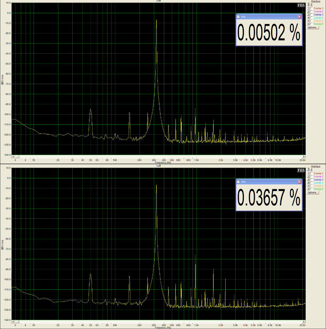 Уровень тока искажений от НЧ динамика сильно зависит от самого динамика и режима его работы ну и фильтр там немного пляшет, не спроста на приведённой оппонентом картинке указана мощность 100Вт и частота 100Гц, сильно похоже на то, что катушку НЧ динамика вывели за магнитный зазор что бы НЧ динамик как можно больше искривил потребляемый ток.