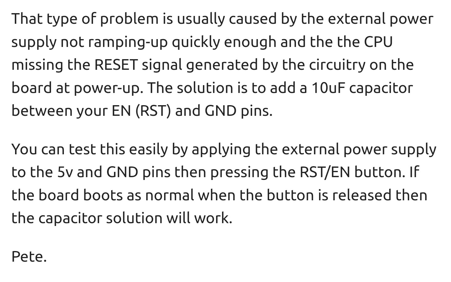 У меня стоит RC цепочка 1кОм/10мкФ на вывод EN, проблем со стартом есп32 нету. Но иногда сам лмс сервер теряет есп32 при переключении питания на есп, нужно заходить в лмс сервер и заново запускать стриминг.