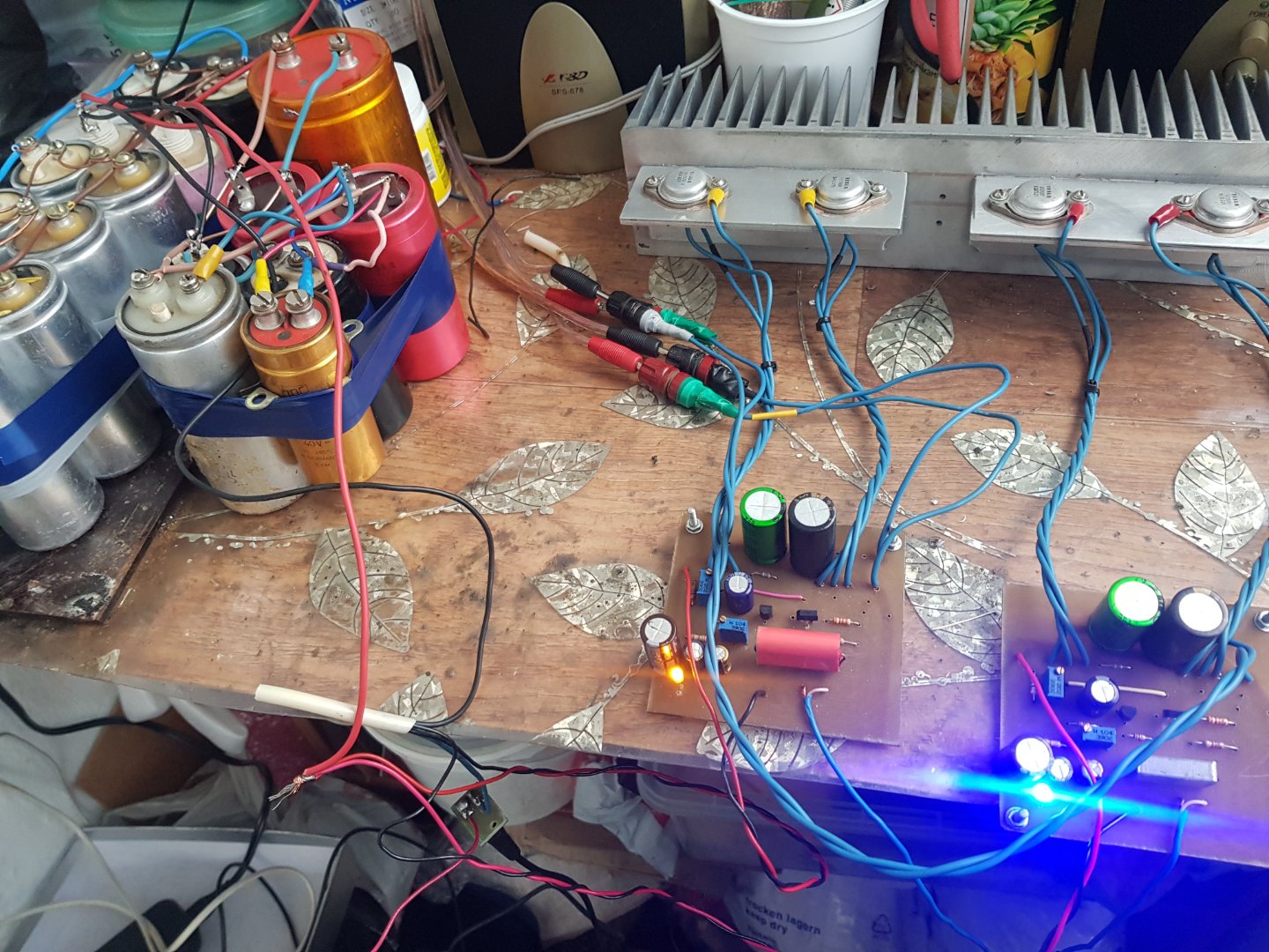 Того замість оттої купи раритетних банок можливо краще було б використати імпульсний блок 300мкФ по входу, що булоб то саме , що ваших 80000мкФна виході. Але це не точно.