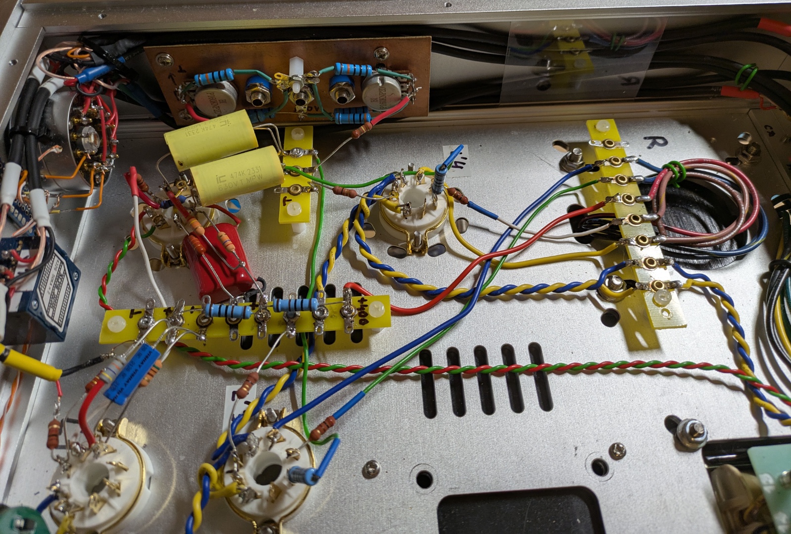 А ось такий вигляд має один канал. Тільки підключити живлення і завести землі в одну точку. Резистори всі на 2 вт. Європейські якісь зовсім маленькі. Як МЛТ 0,5. Метод монтажу перейняв у визнаних японських гуру. Їм певно як і мені було ліньки якось гарно розводити монтажні проводи. :mrgreen: