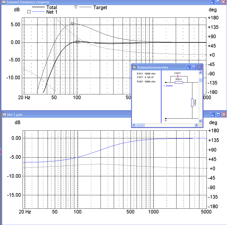 В DBX эквалайзером В пассивном варианте, параллельной RC цепочкой на входе усилителя (R1021 – входное сопротивление усилителя). Кривая Target для моделирования, приблизительно соответствует этой