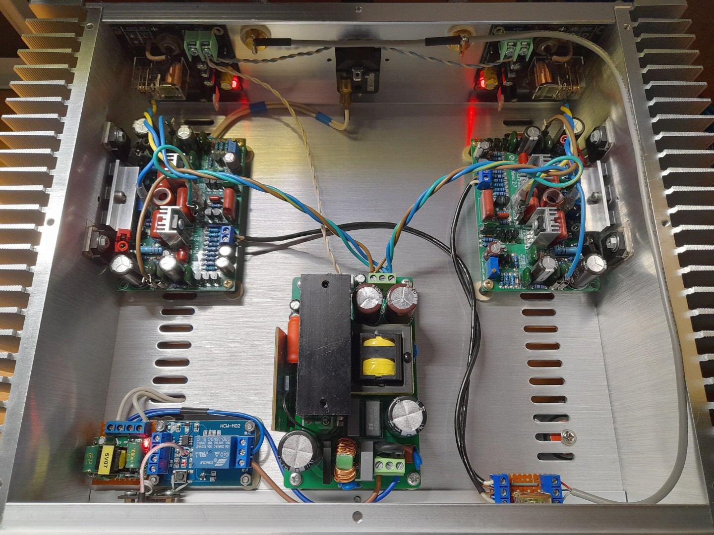 Собрал недавно на 3.64 двойное моно на этих БП (все предыдущие так же собирал до этого), но уже не с китайской защитой, а с Юриной доработкой, конденсаторы выкусил по привычке, так как земли нигде нет. Иногда, примерно раз в час, два, в одной из колонок появился громкий треск. Прям сильный, и пропадал звук на секунд 5. В итоге после длительного громкого прослушивания, вырубились оба канала и горели светодиоды защиты по постоянке на выходе, хотя напряжения на выходе не было, но усилитель не давал стартануть БП. Если через час включить, то всё ок. Температуру замерил, всё в норме, ничего не греется. В выходные решил разобраться, почему все усилители, которые до этого собирал, были лишены данной траблы. Оказалось, что на землю идут пару конденсаторов, а не один (яж не электронщик, глаза разуть было сложно