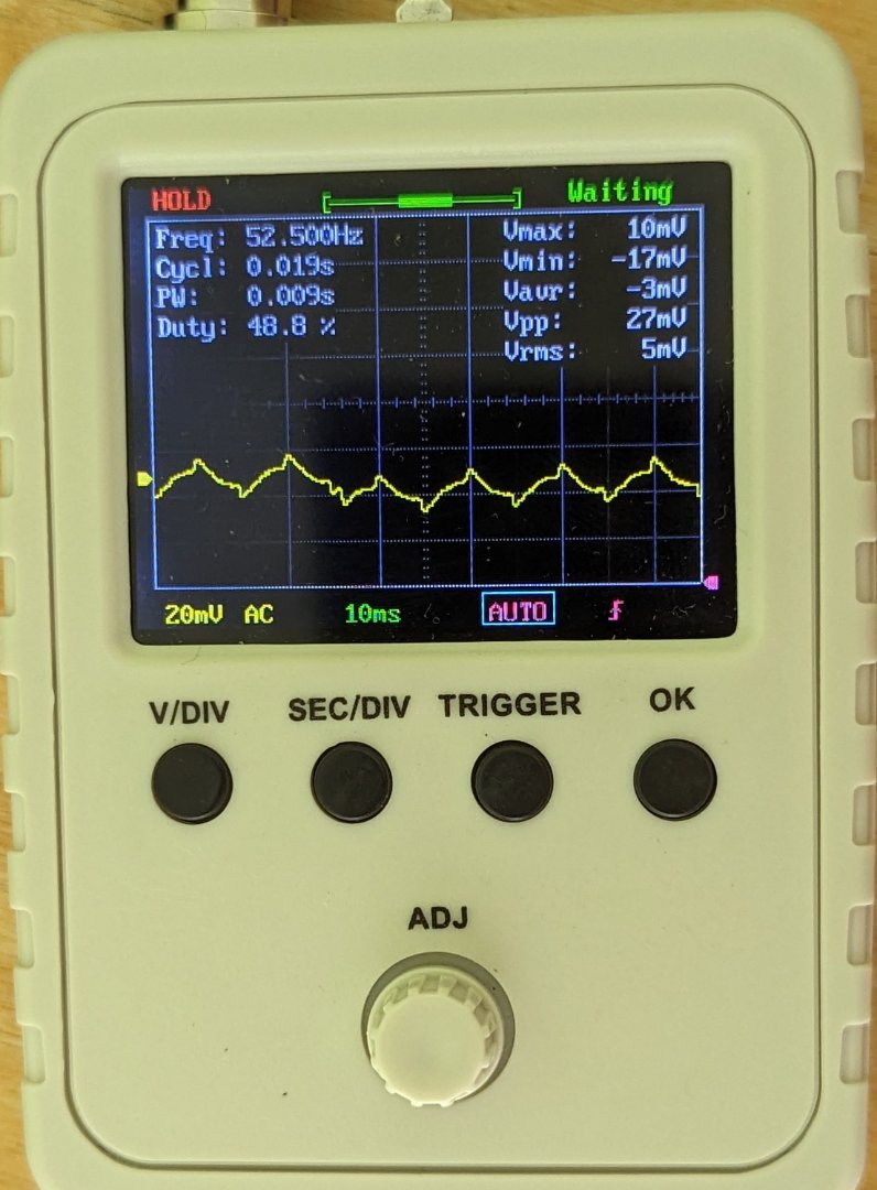 Попытался измерить пульсации, кажется 50 мВ показал, на частоте 52 Гц. Хз насколько эти измерения корректны.