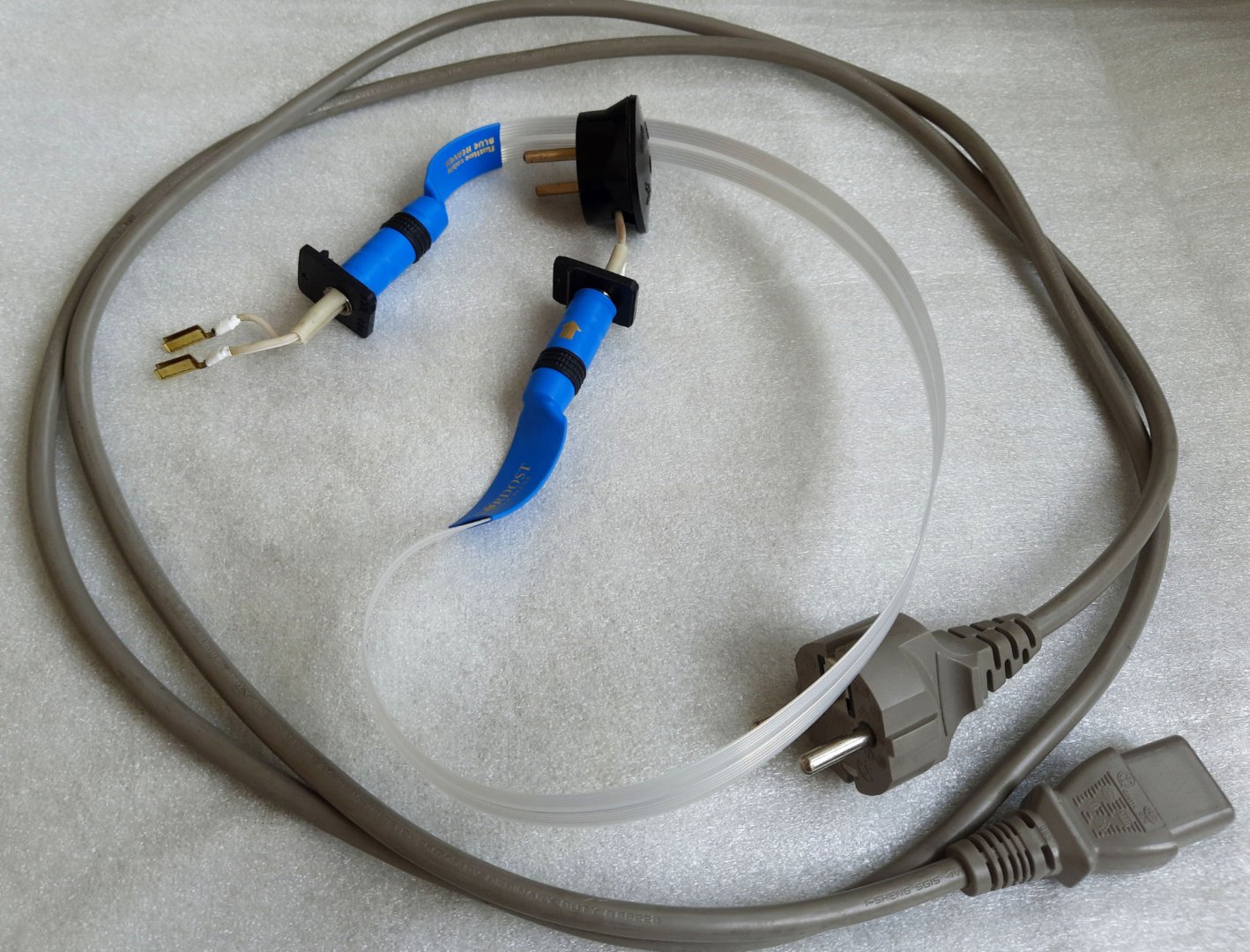 Отож, в якості стандартного - звичайний комп'ютерний китайський I-SHENG, який "стоїть у кожній хаті". Перетин дротів 0,75 мм2. "Супер-пупер" - був змайстрований за декілька годин з доступних матеріалів (все як я люблю). А саме: основа - це міжблочний кабель від пріснопам'ятного Nordost Blue Heaven (подробиці конструції https://www.audiomania.ru/content/art-1263.html), перехідники взяті від RCA роз'ємів телевізора Грюндік 90-х років (мідь чи латунь, магнітом не береться), вилка радянських часів (латунь), дроти тих же часів в ПВХ. Чому саме Blue Heaven? Цей кабель звучить (на диво) саме так, як його описують продавани. І тут не потрібно проводити дослідження. Я вже давно це визначив прослуховуванням в своїй системі і саме його особливості звучання мені не сподобались. Тому лежить у порохах уже більше 20-ти років... Користуюсь звичайними мідними - із ними звук більш збалансований. Потужність програвача 10 вт, тому невеликий перетин кабеля не має істотного впливу на живлення. Так ось, вчора в спокійній обстановці сів та почав слухати. Не буду оригінальним, але різницю я теж не відчув. Якщо вона і є, то настільки мінімальна, що нею можна спокійно знехтувати. Так що маю (для себе) хорошу новину - для своєї Реги залишаю китайчатину, якби це не було мені огидно. Можливо з часом щось зберу більш розцяцьковане.