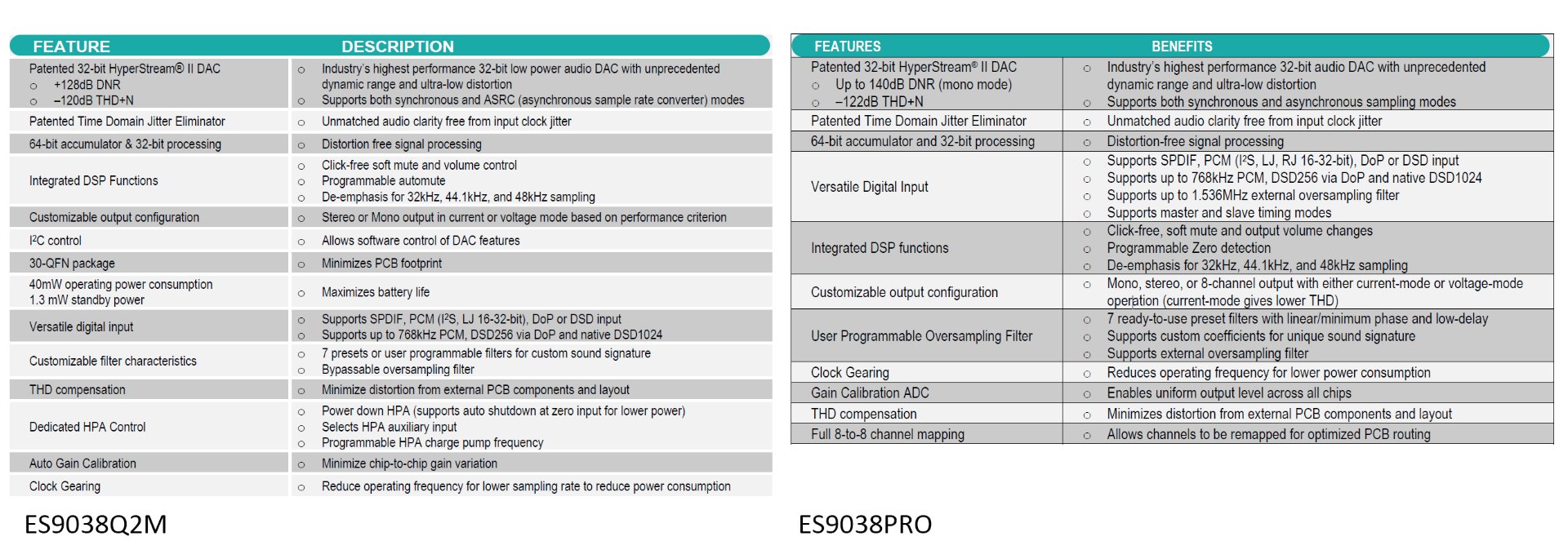Если смотреть по этим datasheet, то es9038q2m - это просто четверть es9038Pro. Но там не все так однозначно... Потребляемая мощность es9038Pro ~465mW, а у es9038q2m в low-power режиме 40mW, а в обычном 53mW. Т.е. разница на канал больше чем в 2 раза в обычном режиме и почти в 3раза в мобильных устройствах. За чей счет банкет, спрашивается?