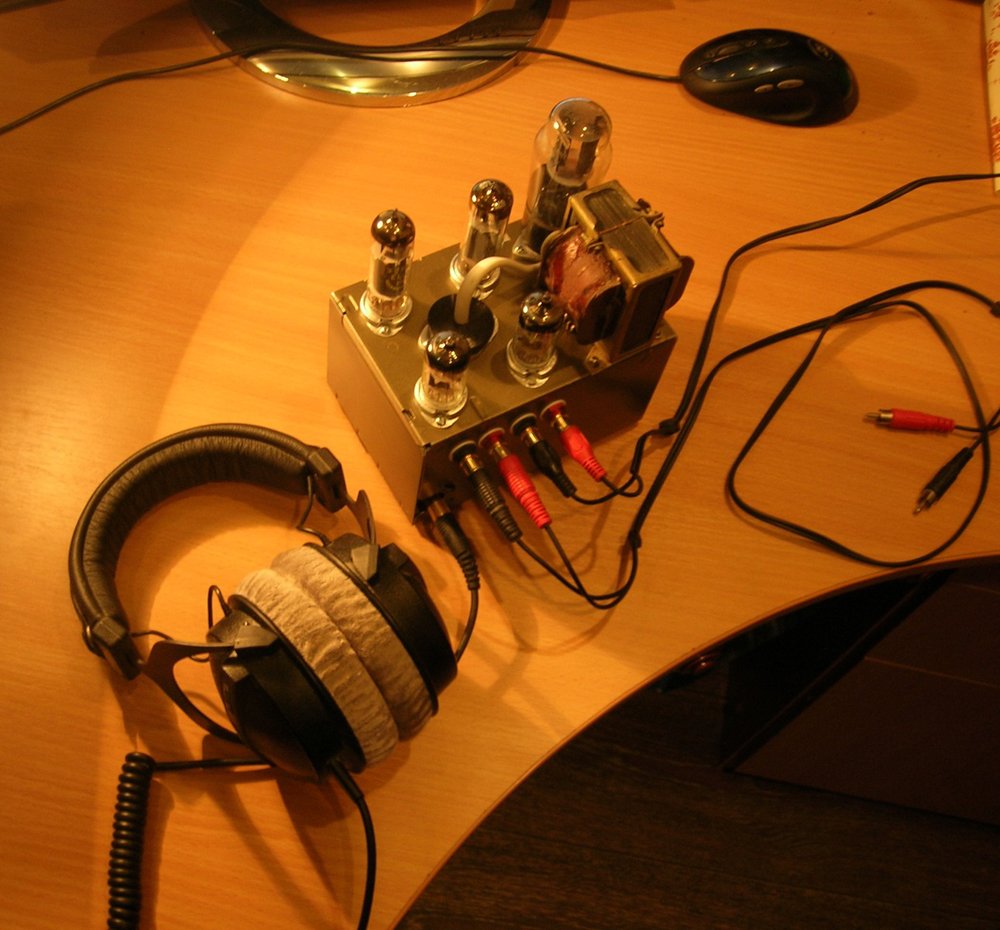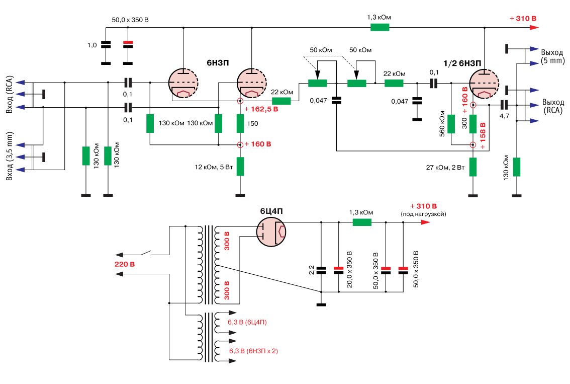 Решил обойтись только тем, что было "в тумбочке". Среди прочего - лампы 6Н3П, электролитические конденсаторы К50-3 и какой-то немецкий на 20 мкФ. Сдвоенный переменный резистор - РП1-57И на 47 кОм. Резистор 12 кОм 5 ватт - "рафинадка". В первом каскаде задействованы обе половинки двойного триода 6Н3П, в выходном - одна половинка лампы.