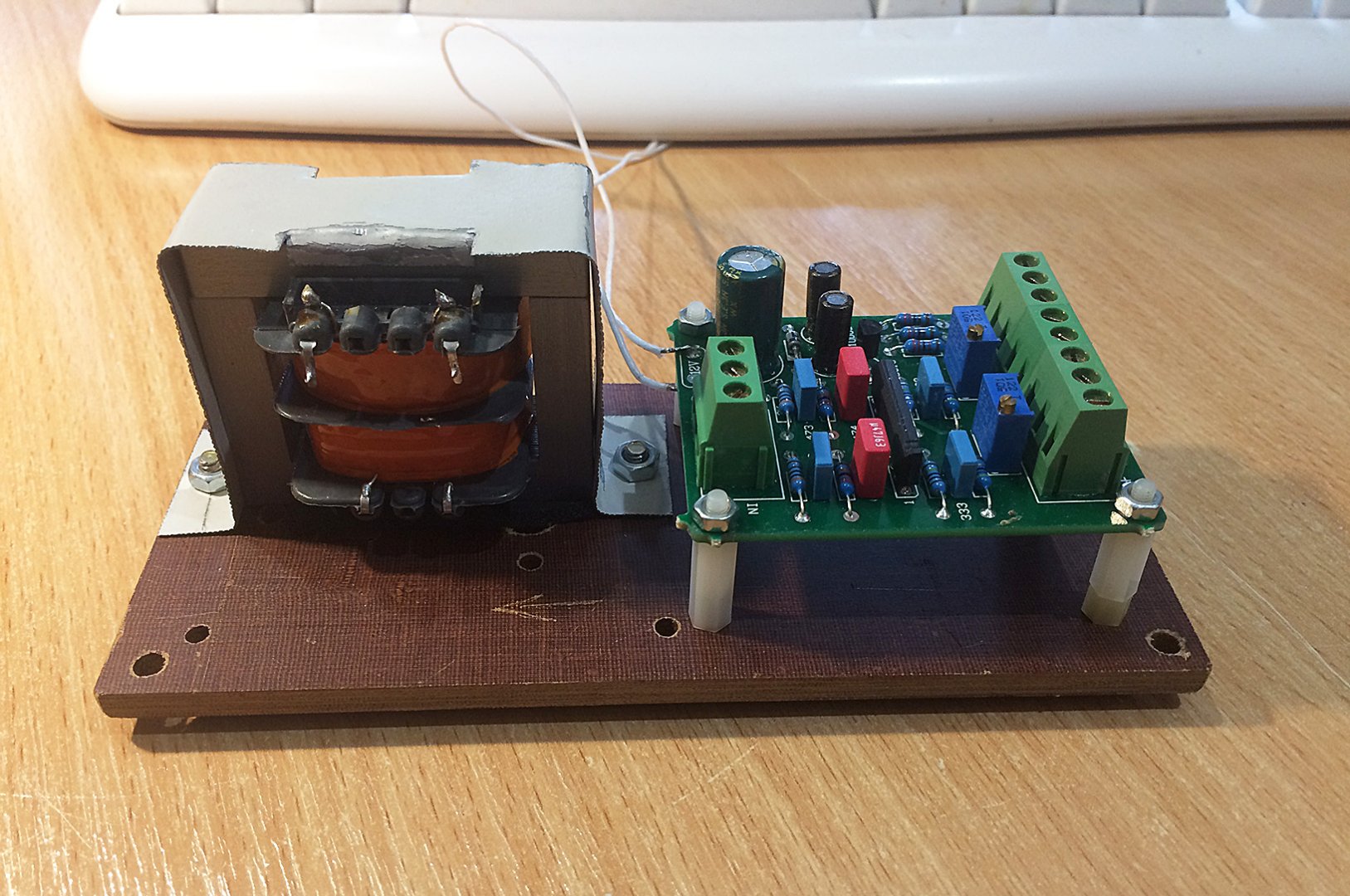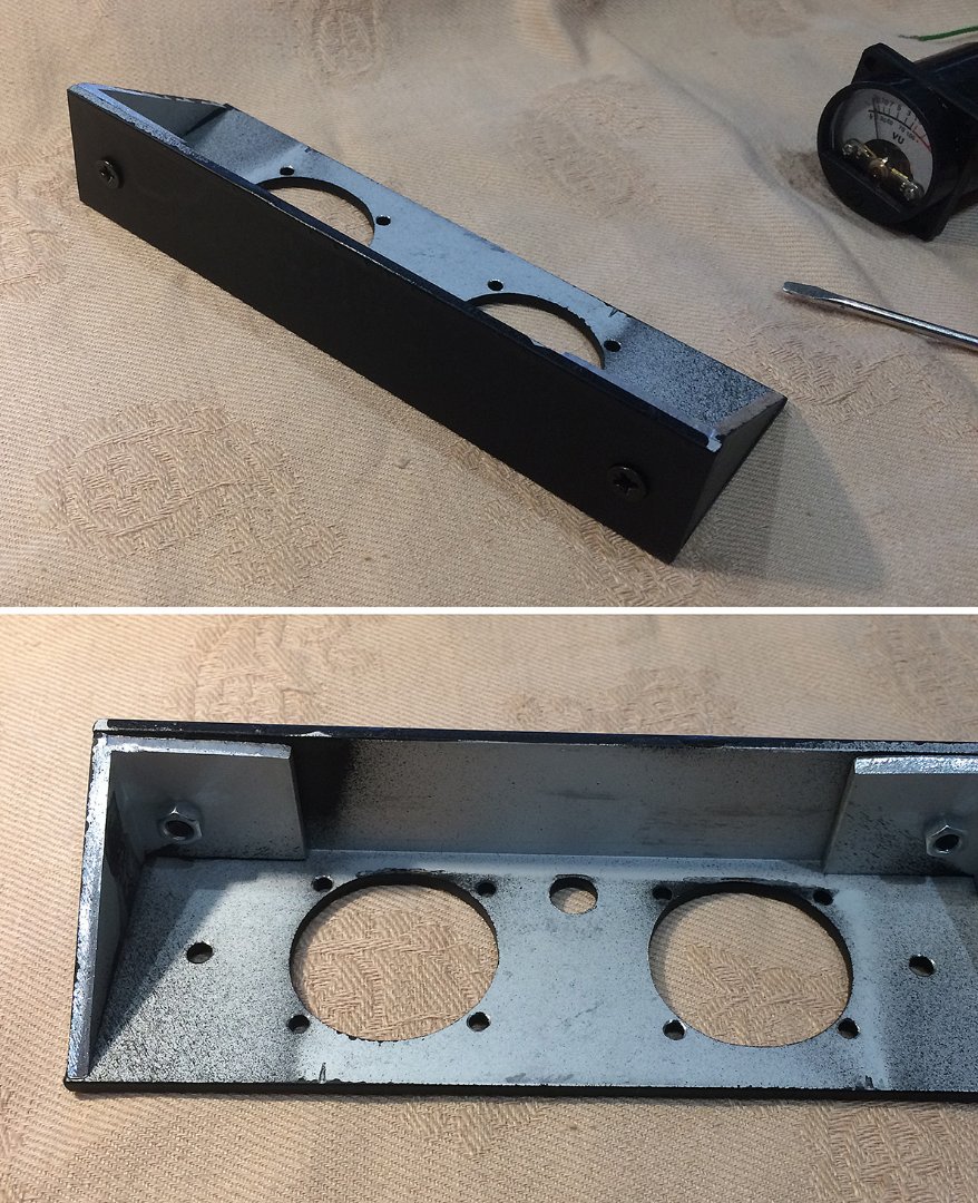 Решил проверить. Включил на ноутбуке программный генератор на 1000 Гц, вольтметром выставил выходной уровень 0,78 вольта действующего значения (~1 вольт ампл.), подключил платку с трансформатором питания и индикаторы... Стрелки со стуком уперлись вправо. Быстро выключил. Подключил через сдвоенный переменный резистор и оказалось, что чувствительность схемы ~40 мВ для положения «0» дБ. И сигнал 0,78 В индицируется как раз как «0» дБ при включении через резисторы номиналом 100 кОм. Сделал крепление из дюралевого уголка. Пришлось повозиться с подгонкой треугольных боковинок.