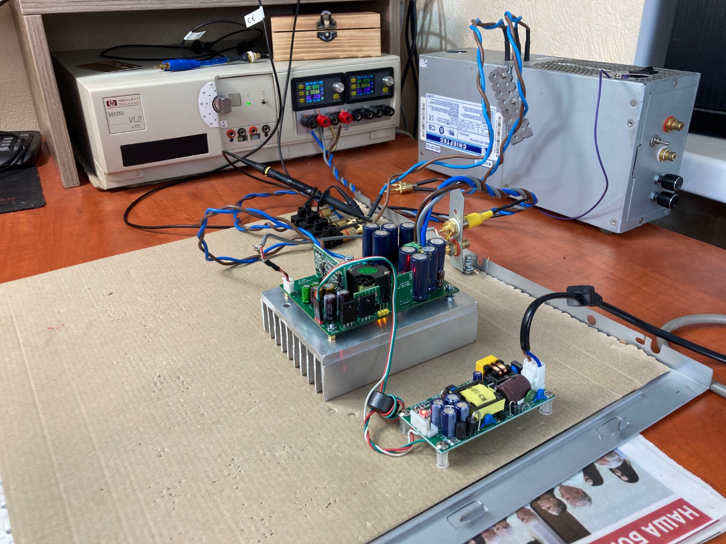 Собрал сегодня вечером стенд для тестирования, подключил плату, проверил все работает и завтра буду начинать тесты. У платы два питания основное от -/+ 30В до -/+ 60В(автор рекомендует 50В) и дополнительное +/- 15В
