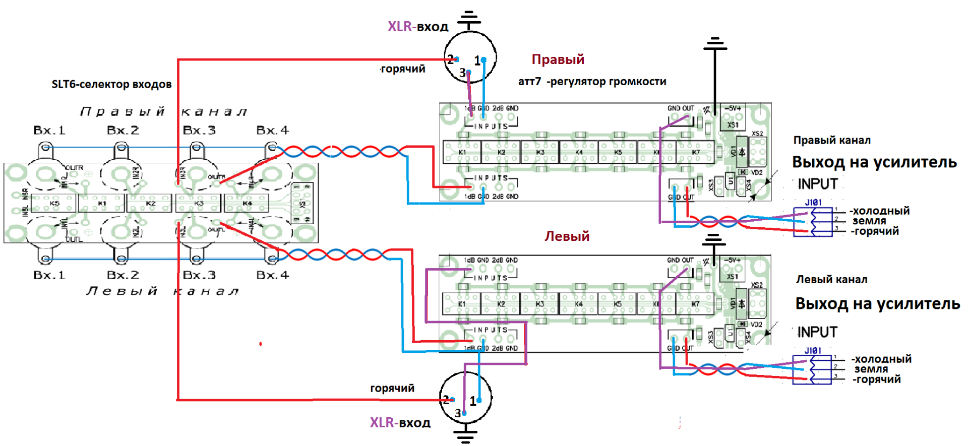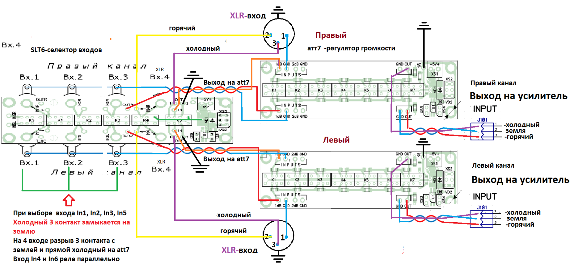 Всем привет, вот теперь схема рабочая должна быть точно для входов RCA и XLR через slt6(селектор входов) и att7