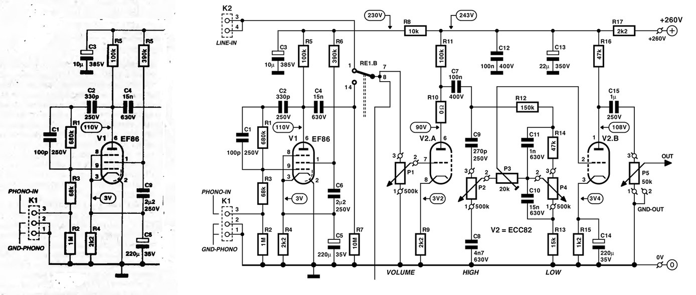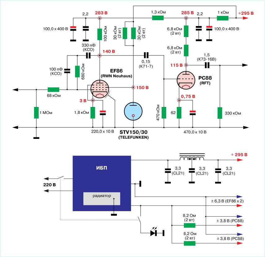 1) напряжение накала ламп PC88 – 3,8 вольта, поэтому накалы включены через гасящие резисторы (существует версия таких ламп EC88 с накалом 6,3 вольта, но у меня их нет)