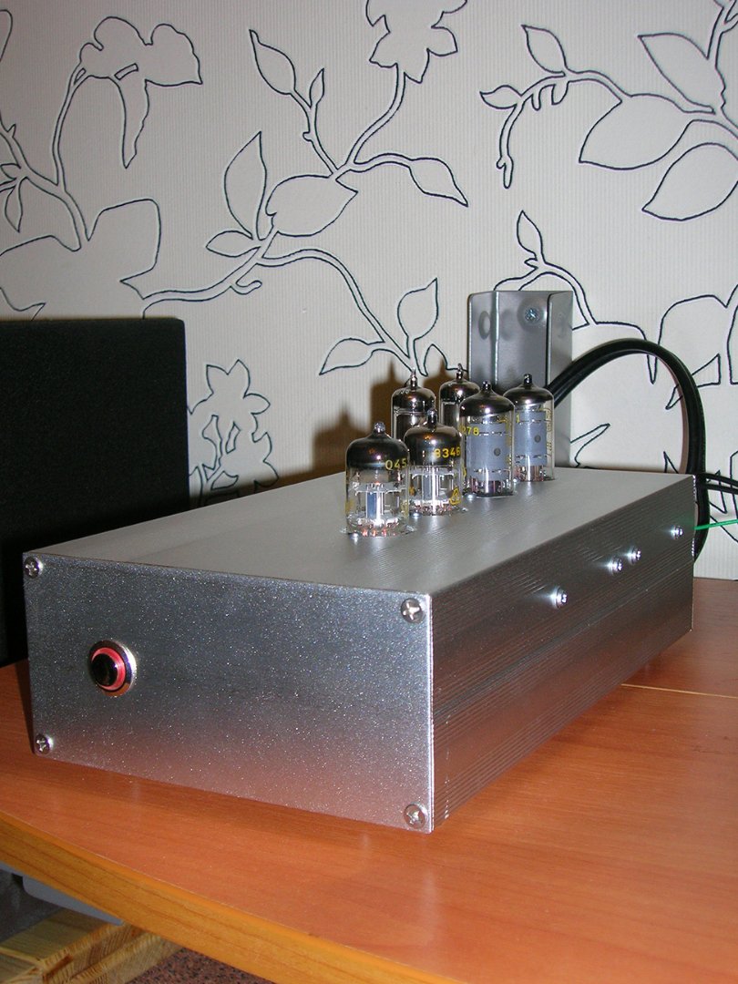 Собрал макет. Включил… и впечатлился. Не ожидал столь хорошего звука. Думал, что будет или неплохо, или как-то не очень. Отбросил все дела и занялся конструкцией «в металле». Корпус у меня был (не помню уже, где и когда купил). Ламповые панельки в этот раз установил внутри (под верхней панелью), а не снаружи корпуса. Использовал импульсный блок питания (такой уже применял ранее). Вот окончательная схема. Из особенностей: