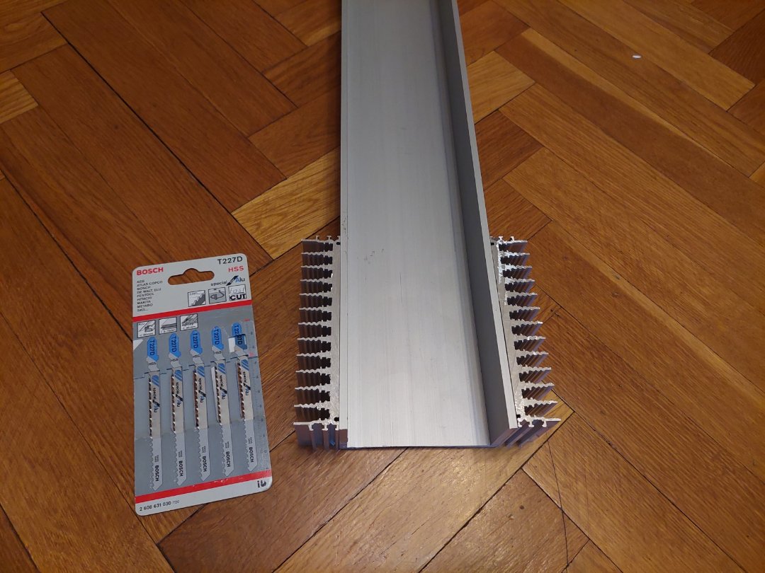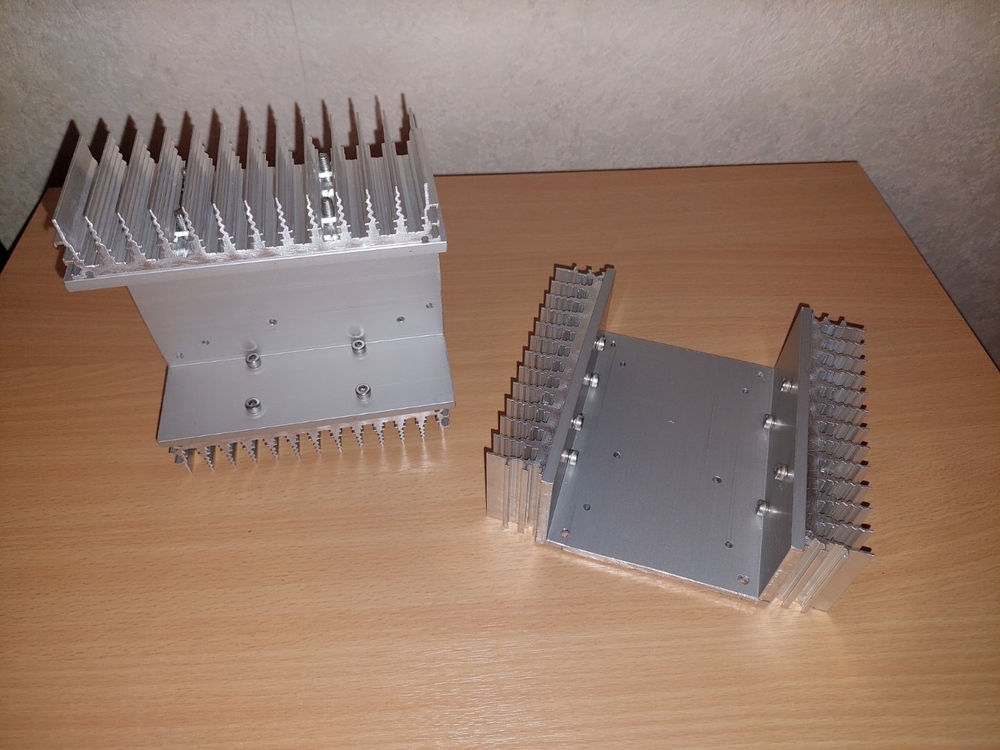 Разметил радиаторные блоки, разрезал специальной пилкой по алюминию, посверлил, термопастой смазал, скрутил - радиаторные блоки со всеми отверстиями под стойки и транзисторы готовы. Если не придираться - вполне аккуратно получилось.