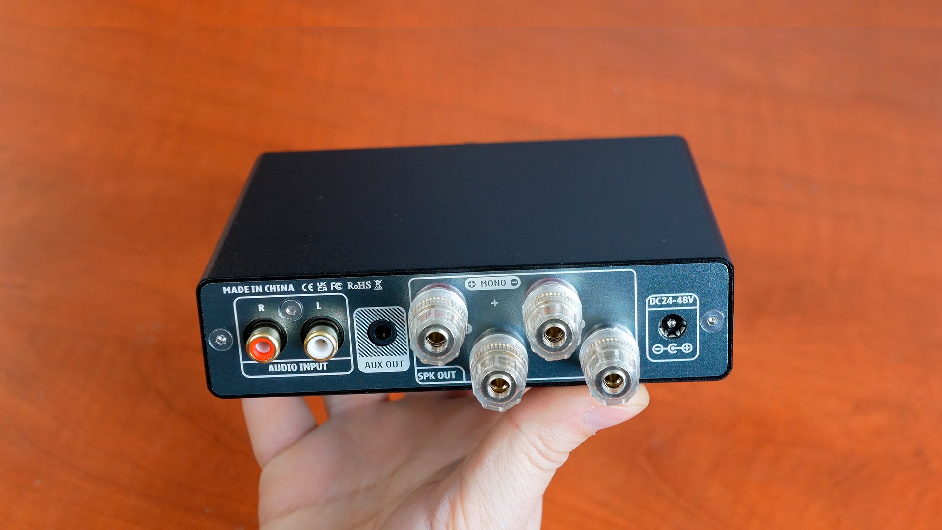 3,5-мм выход AUX OUT для подключения к следующему усилителю без регулировки громкости.