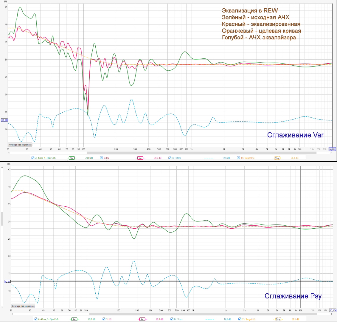 Что бы понять нужна по канальная эквализация или не нужна, нужно смотреть на АЧХ в точке просушивания от каждой АС по отдельности. Только так можно сделать вывод о необходимости по канальной эквализации. Если измерять две АС одновременно то левая АС может компенсировать правую АС в неком частотном спектре что в итоге потом приводит к "дрожанию" КИЗов, сам по этим граблям ходил. Я делаю коррекцию каждой АС по отдельности, а потом уже проверяю суммарную АЧХ от двух АС, обычно если ошибок нету, то суммарная АЧХ от двух АС выходит ровная. Но это всё я веду речь за частоты выше 300Гц, ниже 300Гц там другая песня.