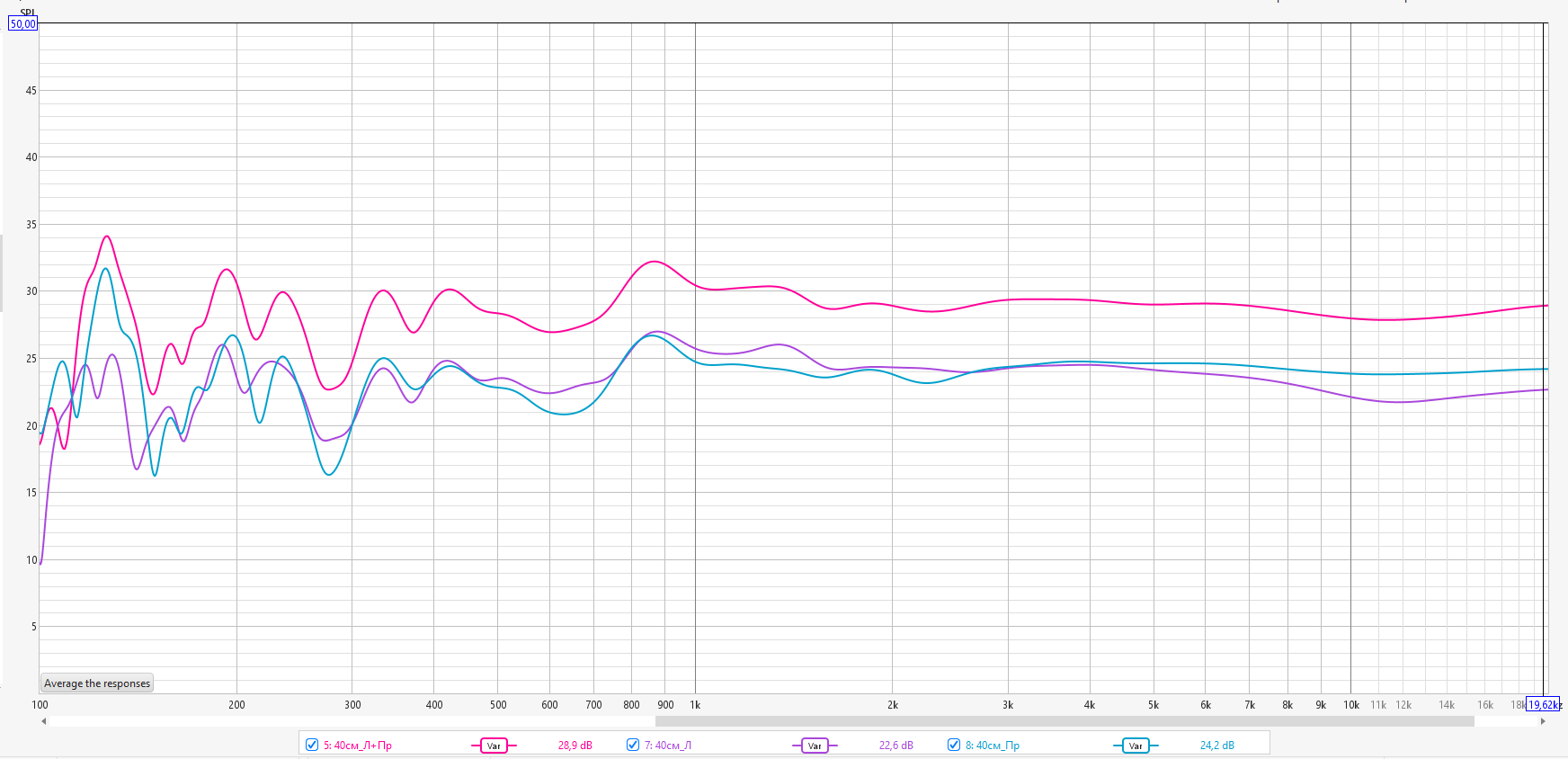 Ещё раз сделал контрольные замеры. Микрофон между АС, в 30-40-50-60-70см от стены.
