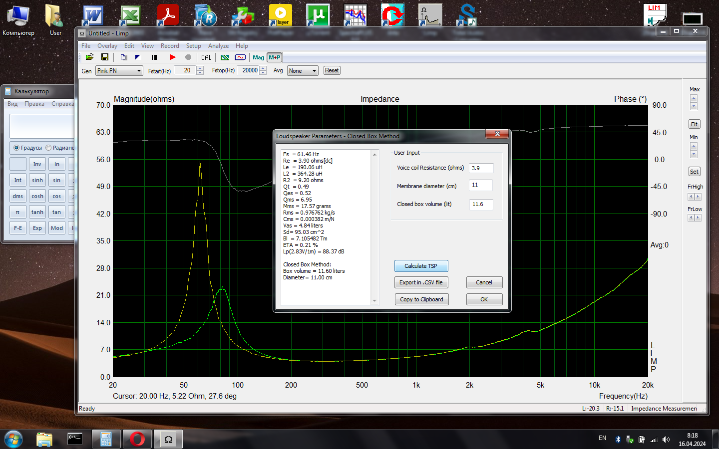 Длина трубы 60мм диаметр 50, поэтому, я просто не знал куда смотреть, теперь понял между горбами где самый меньший импеданс там и частота настройки ФИ, правильно я понял?
