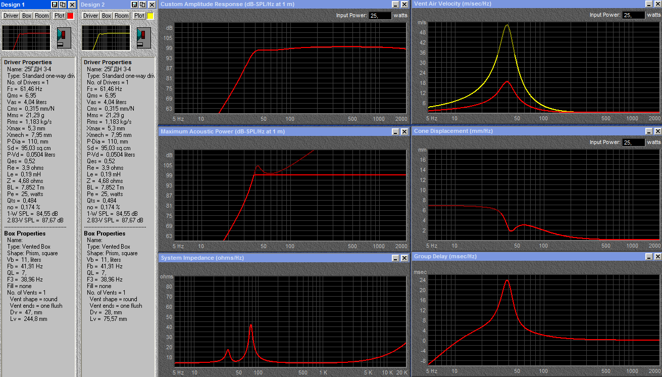 Если подставить эти параметры (из Arta) то настройка порта будет на 2Гц выше (жёлтый график, Fb = 44Гц). Длина трубы при этом, на 3 см короче, 216 мм.