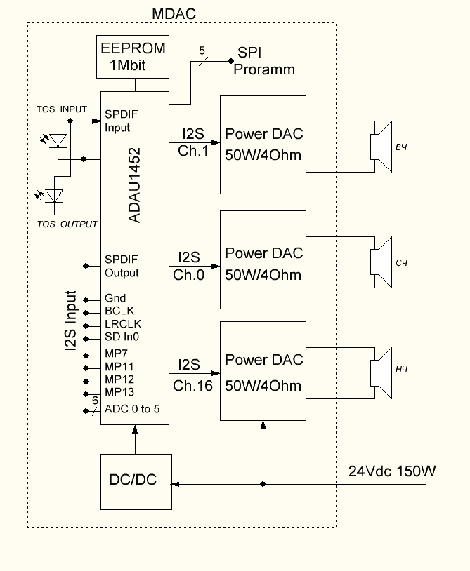 Так как я вкусил преимущества так званых FDA усилителей, и не готов отказывается от преимущество этого направления, то в моём случае оптимальнее всего было применить второй путь т.е. применить специализированную ДСП микросхему под названием АДАУ1452, эта микросхема содержит в себ6е всё то, что необходимо для реализации трёхполосной цифроактивной АС. Бесплатный САПР под названием сигма студио избавляет от необходимости знать математику и программирование что бы достичь результата с помощью адау1452. Когда я ознакомился с возможностями адау1452 то у меня отпали все сомнения в возможности достижения позитивного результата малыми усилиями.
