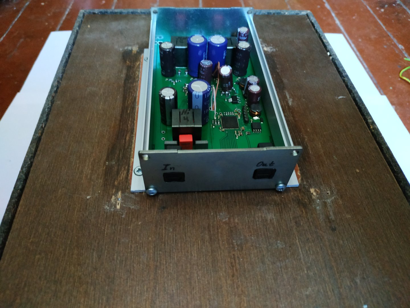 Плату усилителей с ДСП я решил установить на задней стороне АС для более лёгкого доступа к порту программирования ДСП. Для этого я применил алюминиевый корпус который так же выступает в качестве радиатора, блок питания я установил внутри АС, для соединения ЦАПа с питанием и динамиками были просверлены отверстия в нужных местах, светодиод выведен на переднюю панель.