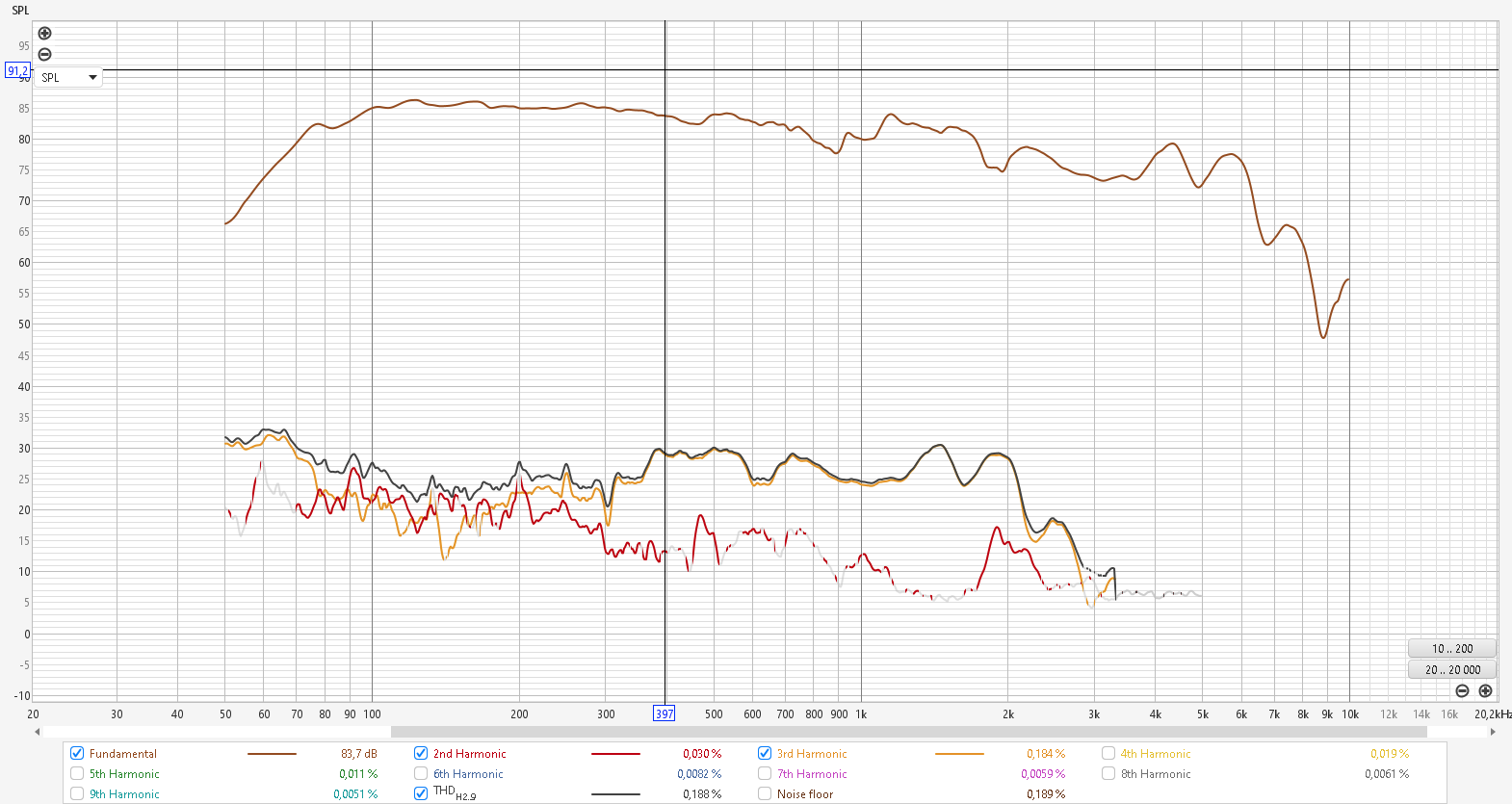 По результатам измерений видно что НЧ динамик держит более менее ровную АЧХ до 800Гц, но рост искажений начинается с частоты 350Гц, при этом СЧ динамик работает с относительно малыми искажениями от 300Гц до 2,5кГц, в общем более менее оптимальная частота деления НЧ и СЧ это 300Гц, а между СЧ и ВЧ это 2,5кГц.