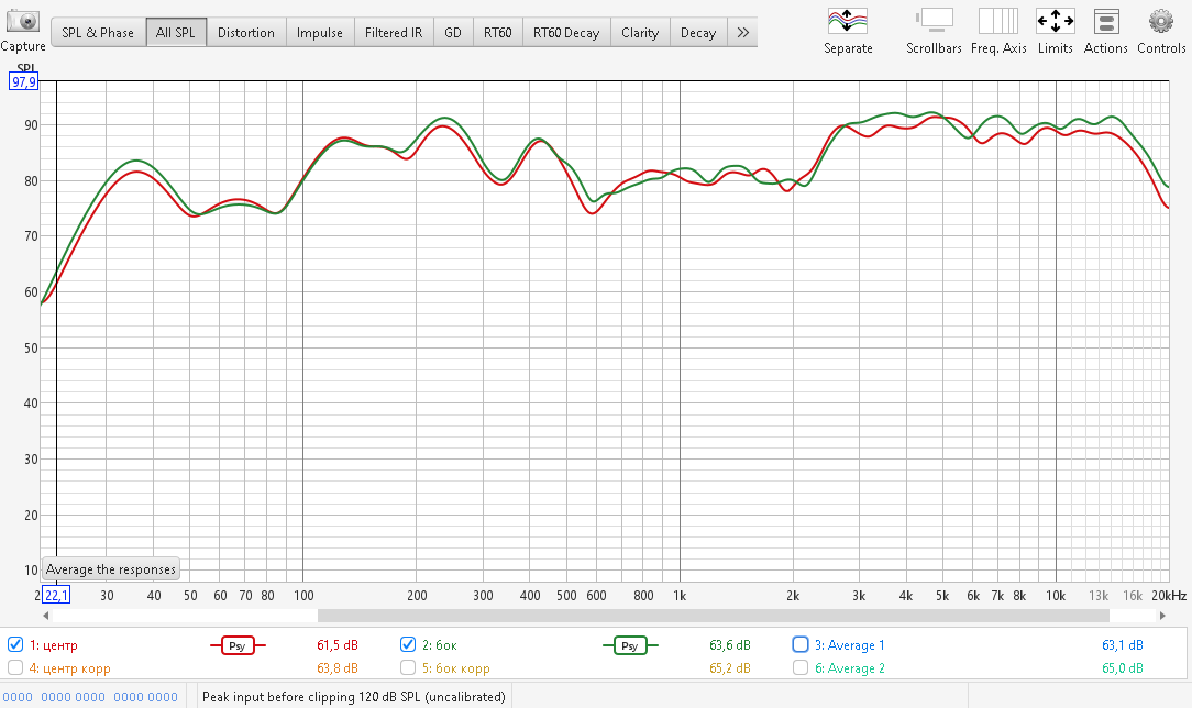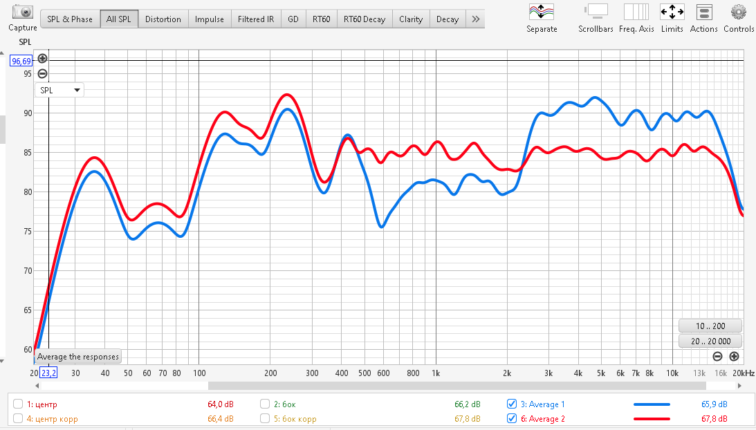 Ниже АЧХ полученные в зоне прослушивания в двух точках.
