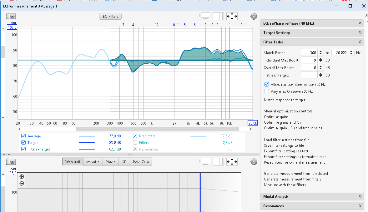С помощью программы REW на основании измеренной АЧХ в зоне прослушивания рассчитываем необходимые настройки фильтров эквализации предварительно задав условия что мы это делаем для программы ReFaze.