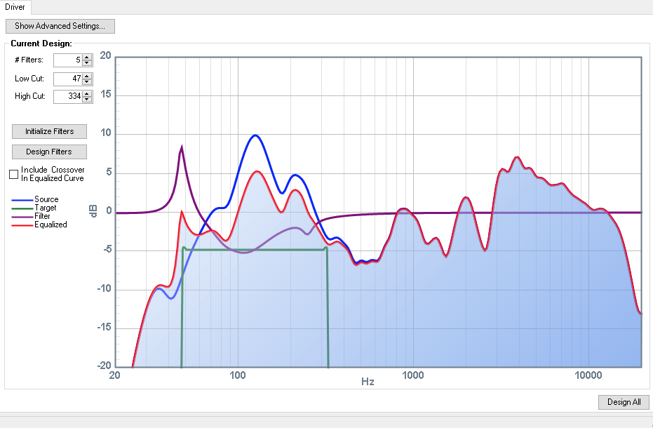 Но есть один нюанс в КИХ фильтре, что бы скорректировать АЧХ на низких частотах, нужно применять длинный фильтр который уже вносит неприемлемую задержку в сигнал при просмотре видео. С другой стороны методом проб и ошибок я пришёл к выводу, что нет нужды корректировать НЧ диапазон с большой точностью, другими словами в НЧ диапазоне можно смело применять эквализацию с помощью БИХ фильтров.
