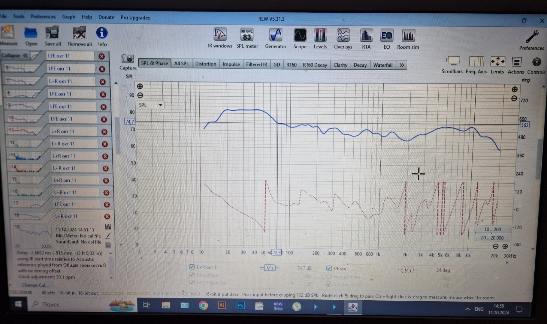 У меня не будет хватит задержки для саба на onkyo rz840 чтобы поставить нужную фазу,сейчас остановился на кроссовере в 90 герц,на слух ачх устраивает,дополнительно удалось сделать плавный спад от 20 до 15 герц в месте прослушивания,правда резал саб довольно сильно эквалайзером.uriy писал(а): 07 окт 2024, 23:36 Есть такая хорошая программа как RePhase, она позволяет крутить фазу как угодно и где угодно если вам хватит тапов в адау.