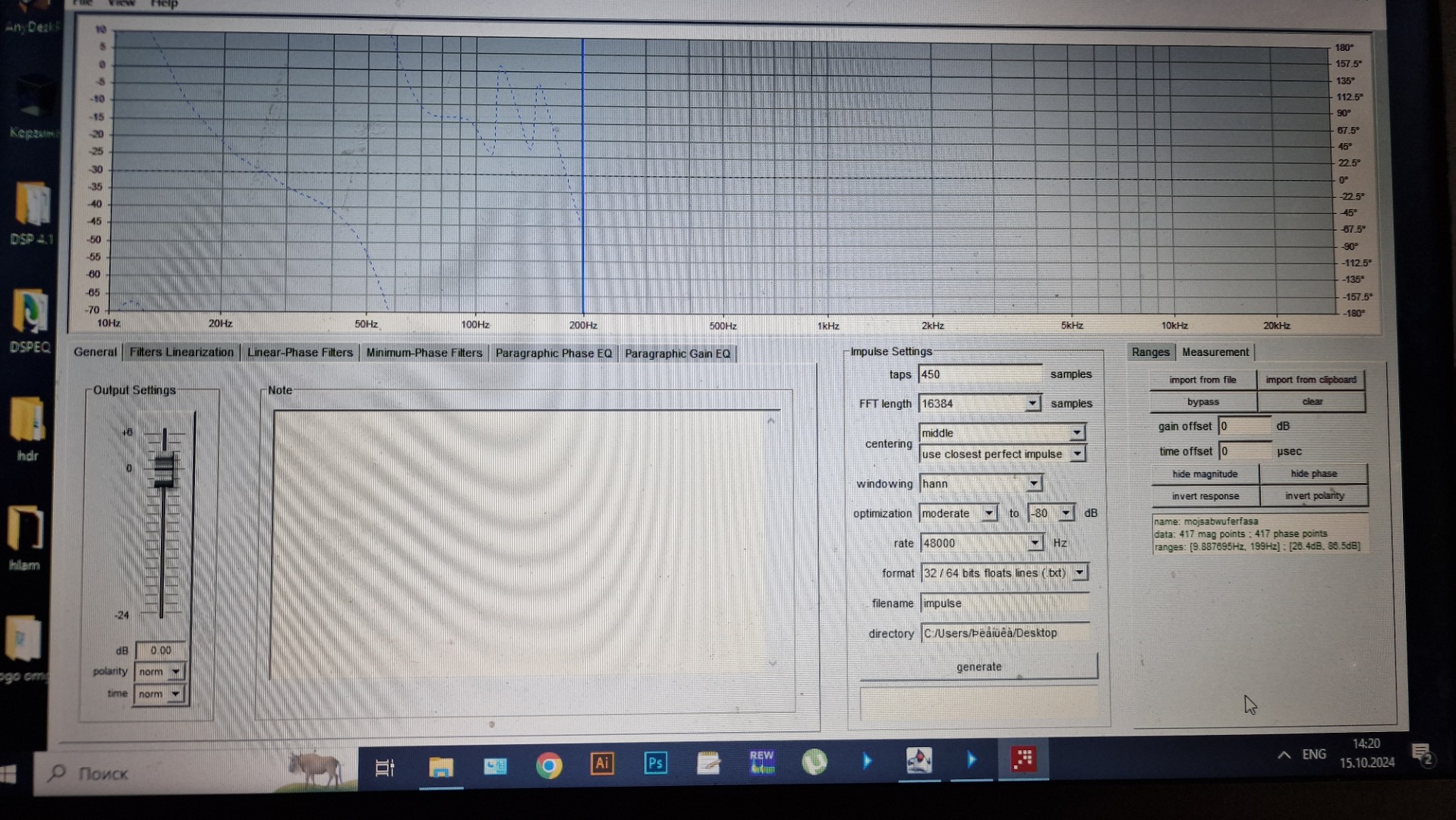 Есть математический метод, только этой математике придётся обучатся на пару порядков дольше чем с неким узко заточенным сапром.audiomaniac3 писал(а): 07 окт 2024, 23:09 Попробую разобраться хоть для меня это дремучий лес,может есть способ математический подобрать фильтр, чтобы до 110 герц фаза осталась как есть, а от 110 до 130 опустилась,разница по фазе на 130 герц (105) (-145) градусов