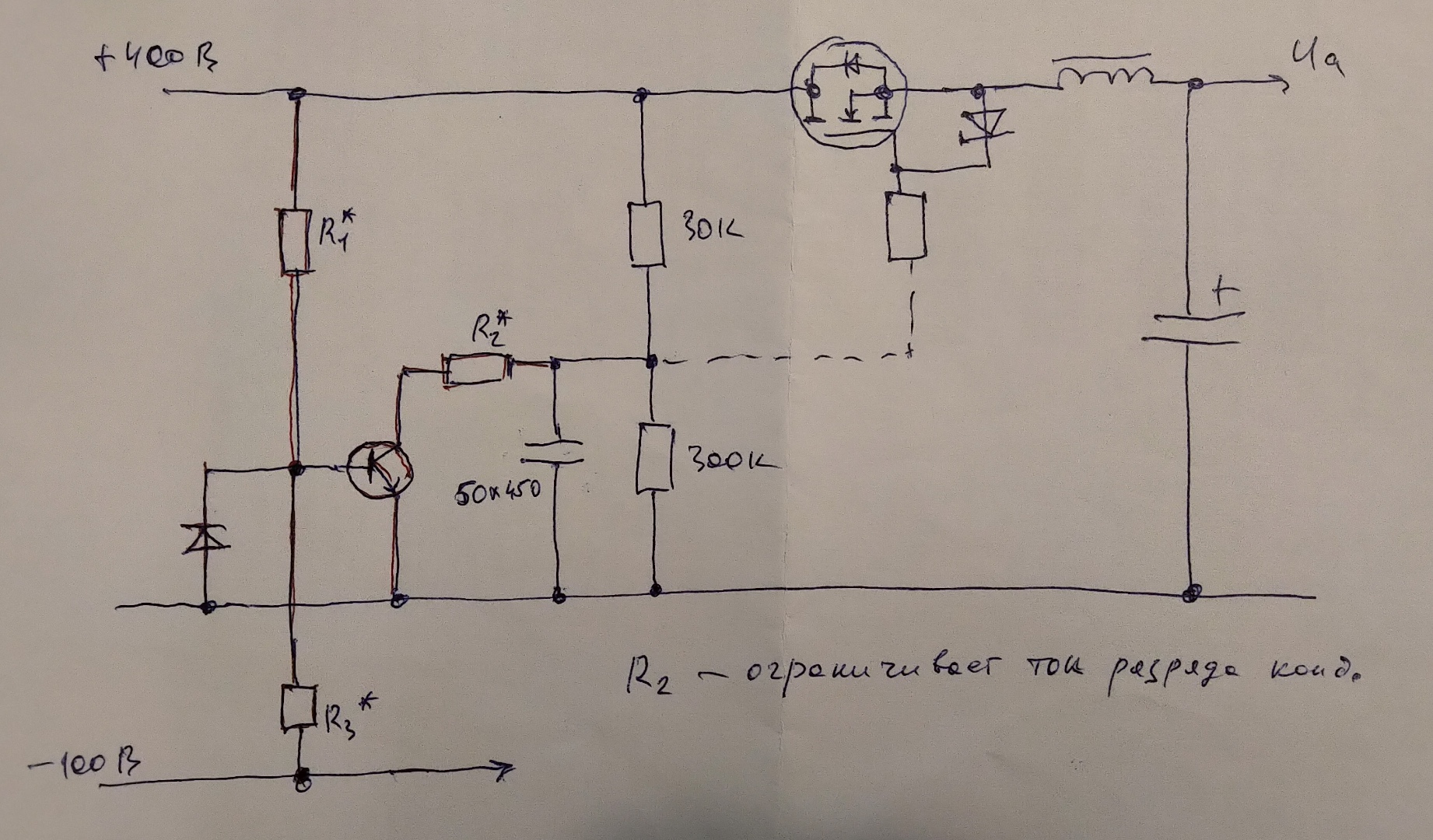Я трохи подумавши вирішив ввести схему захисту. А так як самому щось не думається, попросив на Везі. І ось що мені запропонували: при зникненні напруги -100 В транзистор електронного дроселя просто виключить подачу анодної напруги.gelert писал(а): 03 окт 2024, 22:06 Стосовно наведеної вами схеми. При зникненні контакту движку напруга зміниться в напрямку збільшення струму аноду. Добре, що не зникне зовсім, але в залежності від положення движка може бути всяке.