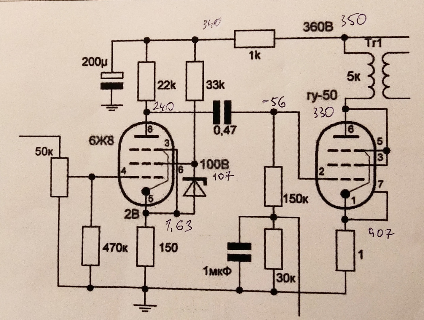 Резистор на 30кОм що знаходиться в схемі потрібно зняти? Бо він сильно посадить напругу. Я вже зробив по схемі що запропонував gelert, підставивши замість 30К RV1 і R2. Ось так. Принцип похожий. І ще, я хочу зняти необхідну напругу для зміщення з анодної обмотки по схемі однопівперіодного випрямлення, щоб не використовувати допоміжний трансформатор.LinuxManiac писал(а): 07 окт 2024, 09:25 Схильність до переходу у саморозігрів дійсно притаманна деяким потужним лампам. Для ГУ-50 це не характерно зовсім.
