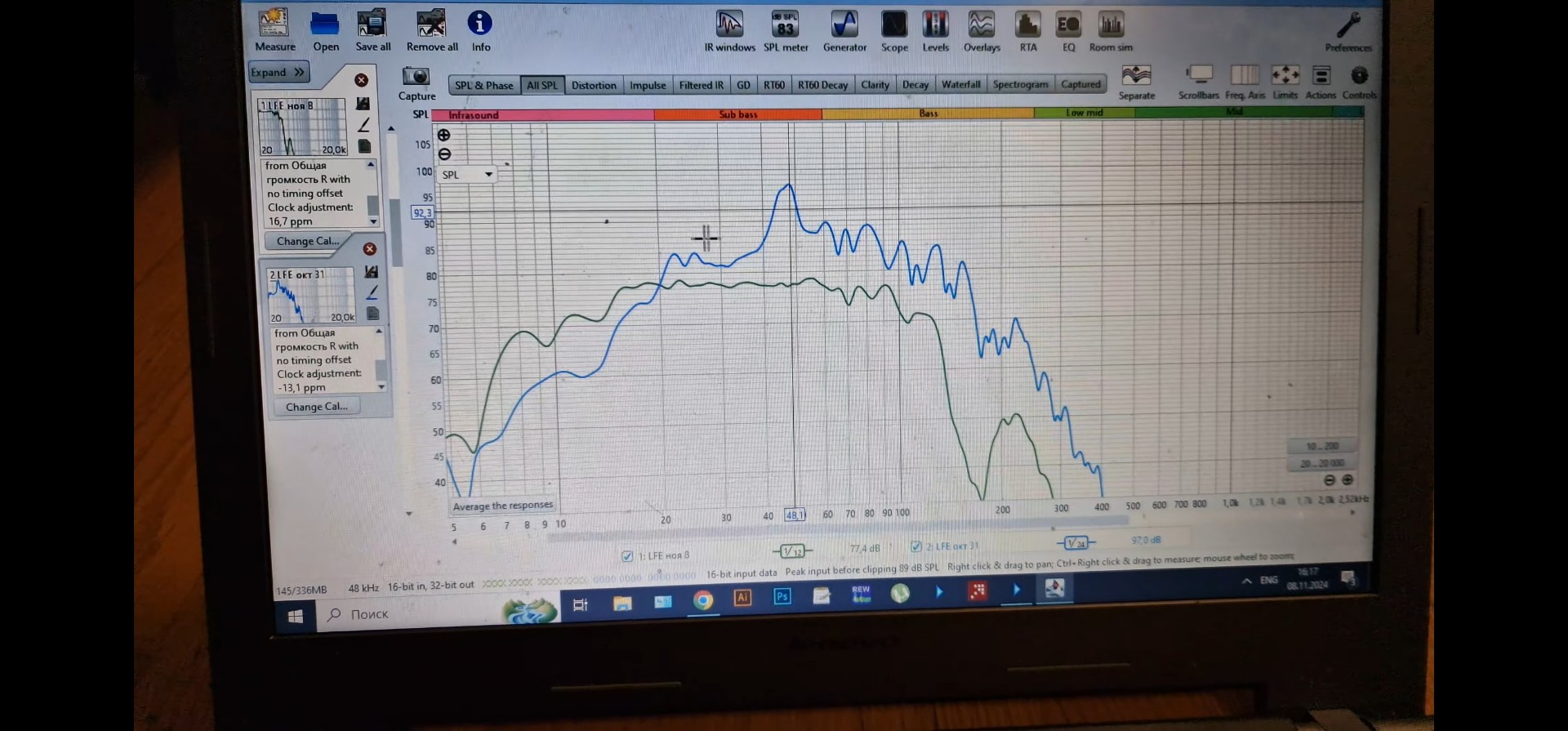 Замер и корректировка ачх даст больший прирост к восприятию звука чем покупка новой аудиокарты,я бы мог тоже пробовать покупать более дорогие кабеля или более дорогой саб,но резонанс моей комнаты на месте прослушивания никуда бы не делся,мой замер до и после корректировки.