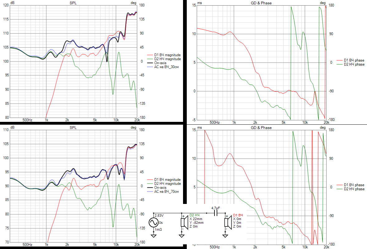 В симулятор заведены импедансы и АФЧХ динамиков (на баффле), снятые с одинакового расстояния по центру каждого. Комнатные отражения обрезаны «окном». Задержка сигнала выставлена одинаковая для НЧ и ВЧ. Указаны координаты динамиков на баффле и введена схема фильтра.