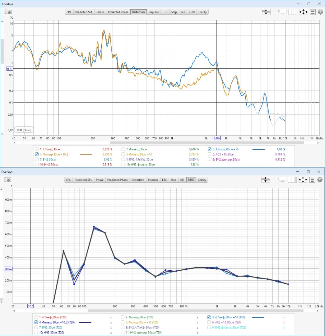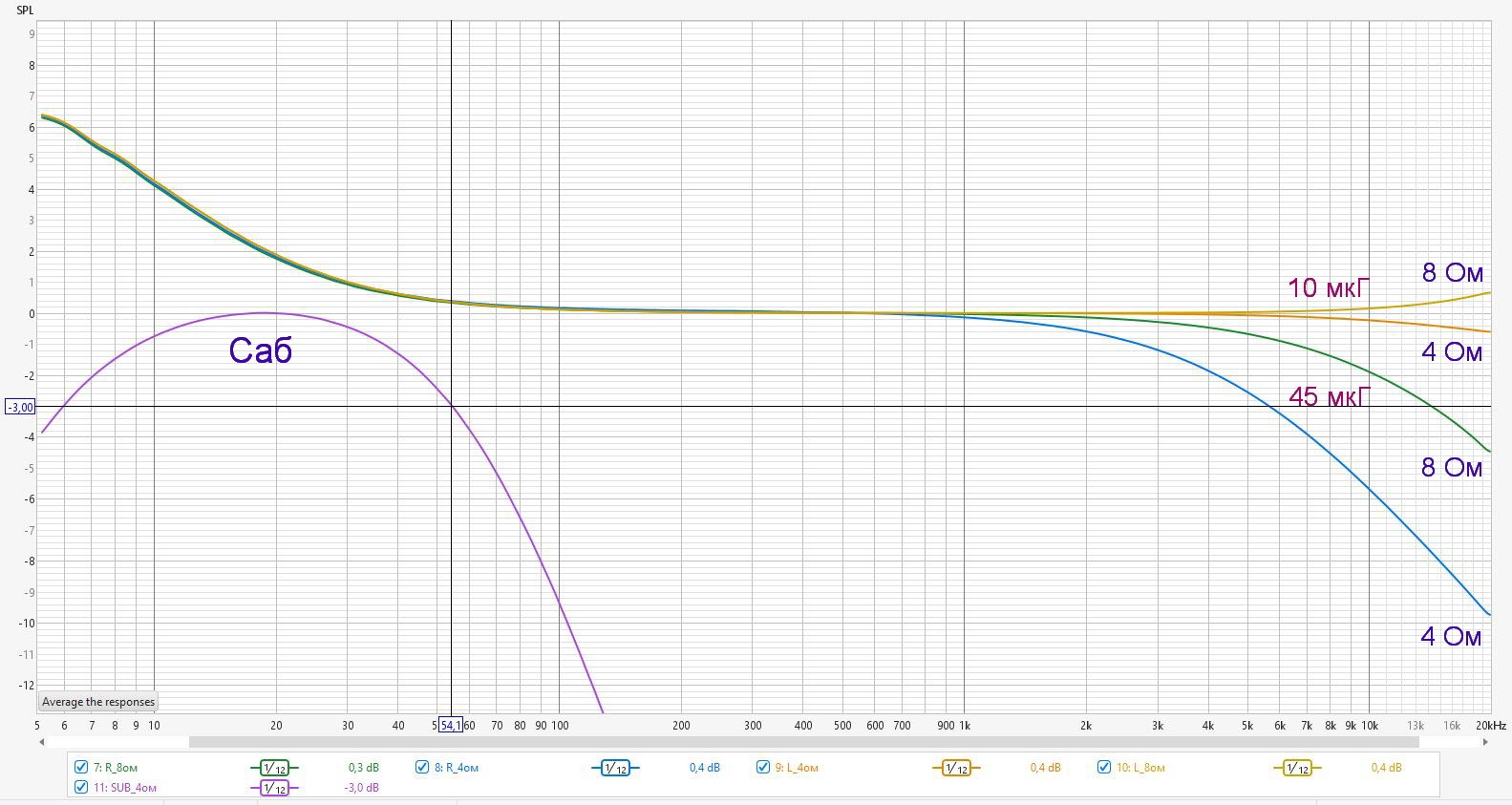 Смотрим что получилось для заданных расстояний прослушивания (в данном случае 30 и 70 см, уши на уровне ВЧ).