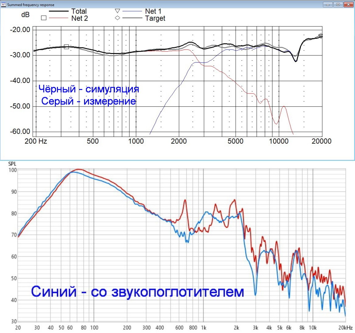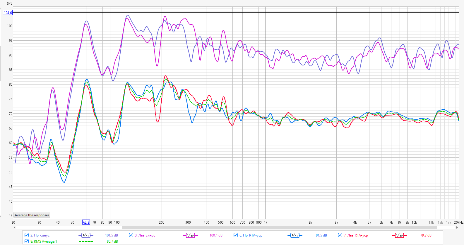 На графике оба вида измерений. Верхние кривые свип, нижние шум (методом качания микрофона). Что интересно, этот метод сглаживает «гребёнку» на ВЧ, получившуюся измерением свипом из одной точки, и вызванную ранними отражениями пищалки, с более широкой чем у мида диаграммой направленности.