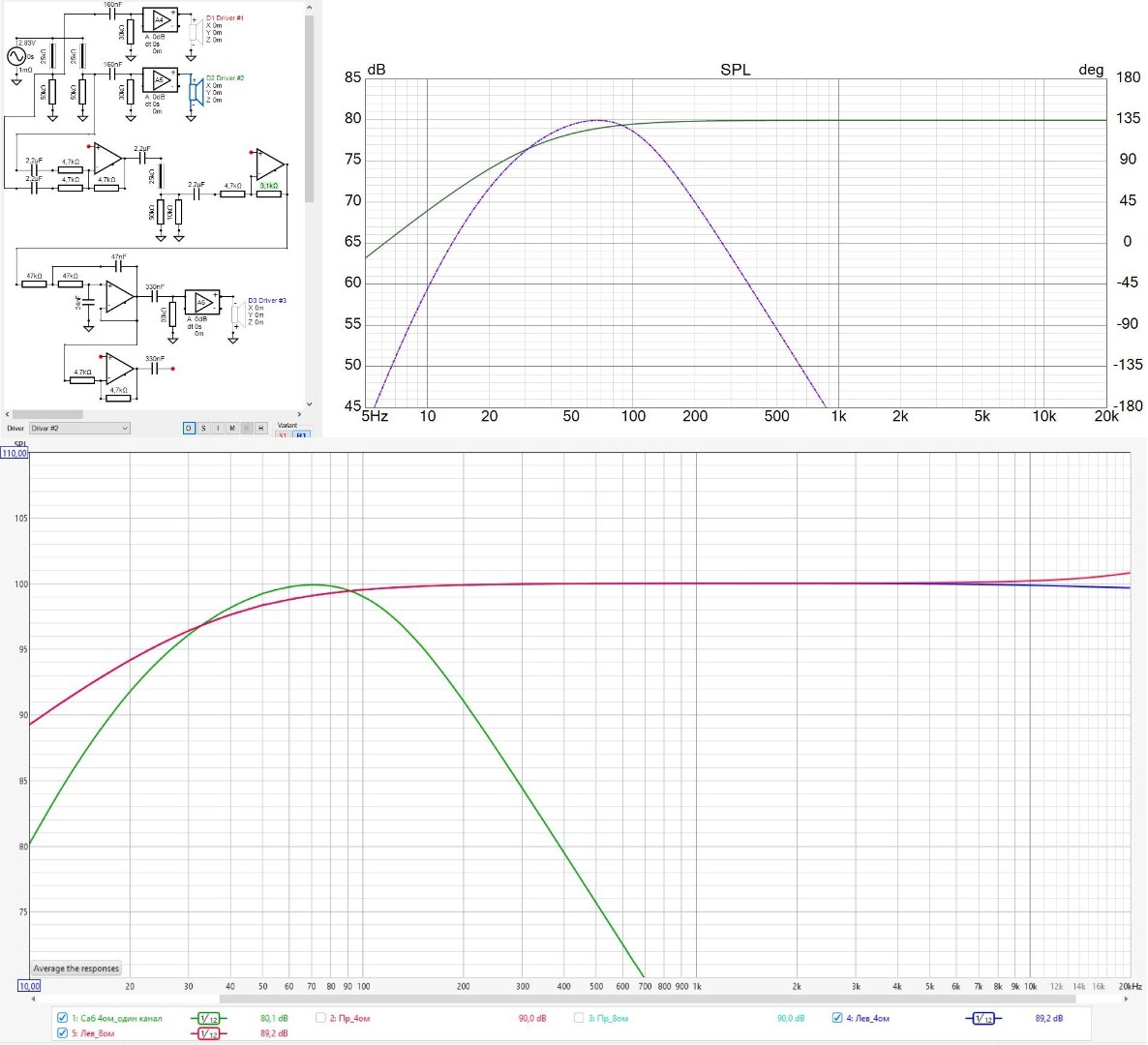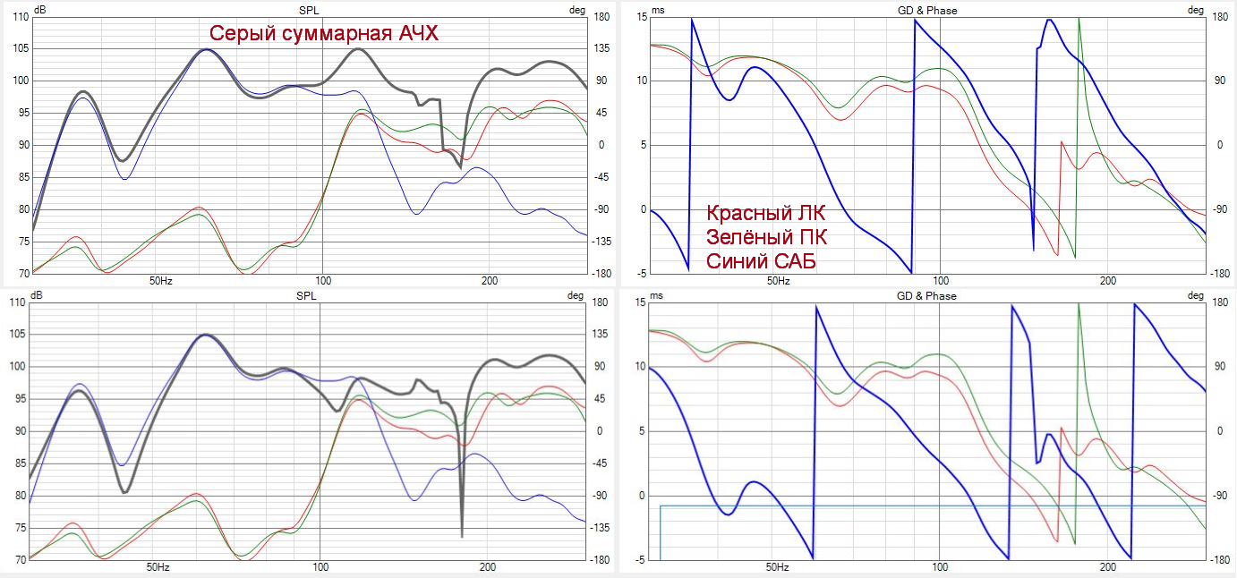 Верхний рисунок - саб в фазе к сателлитам (как сейчас), нижний рисунок – в противофазе. На верхнем рисунке, разъезд фаз на 120Гц между сателлитами и сабом около 40°, на нижнем практически 180° (о чём напоминает провал на АЧХ).