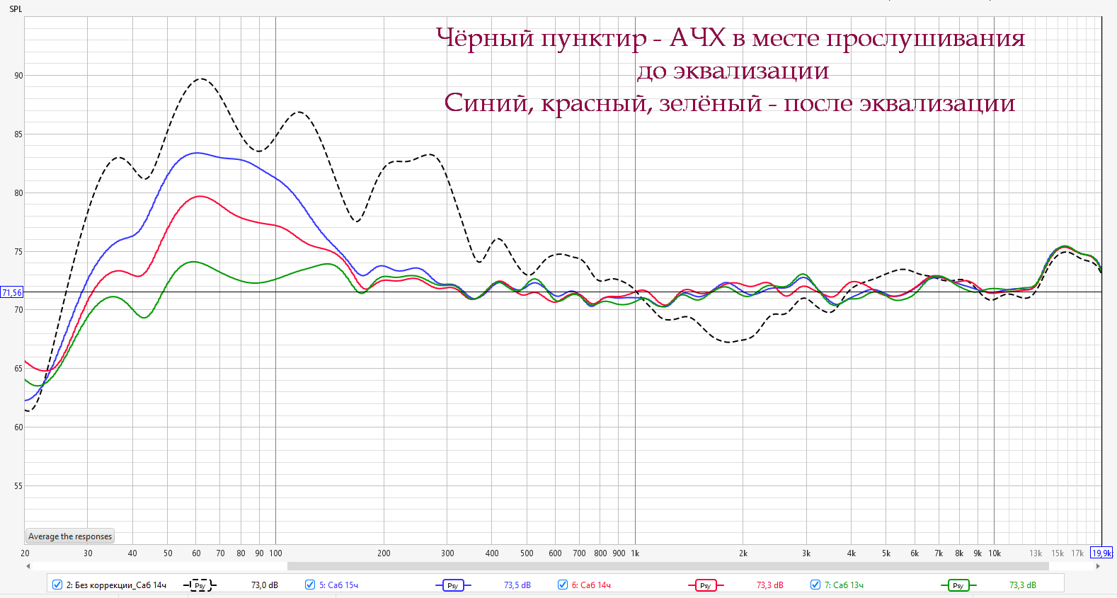 Я там имел в виду то, что чем ближе к АС тем легче рихтовать АЧХ с позитивным результатом т.к. комната меньше вносит отсебятину на прямую волну. Чем дальше от АС тем тяжелее рихтовать АЧХ с позитивным результатом т.к. в измерениях влияние комнаты уже более обширно.Justas* писал(а): 11 апр 2025, 15:45 В моём случае, от влияния комнаты не избавляет, провалы на НЧ коррекцией не выправить.