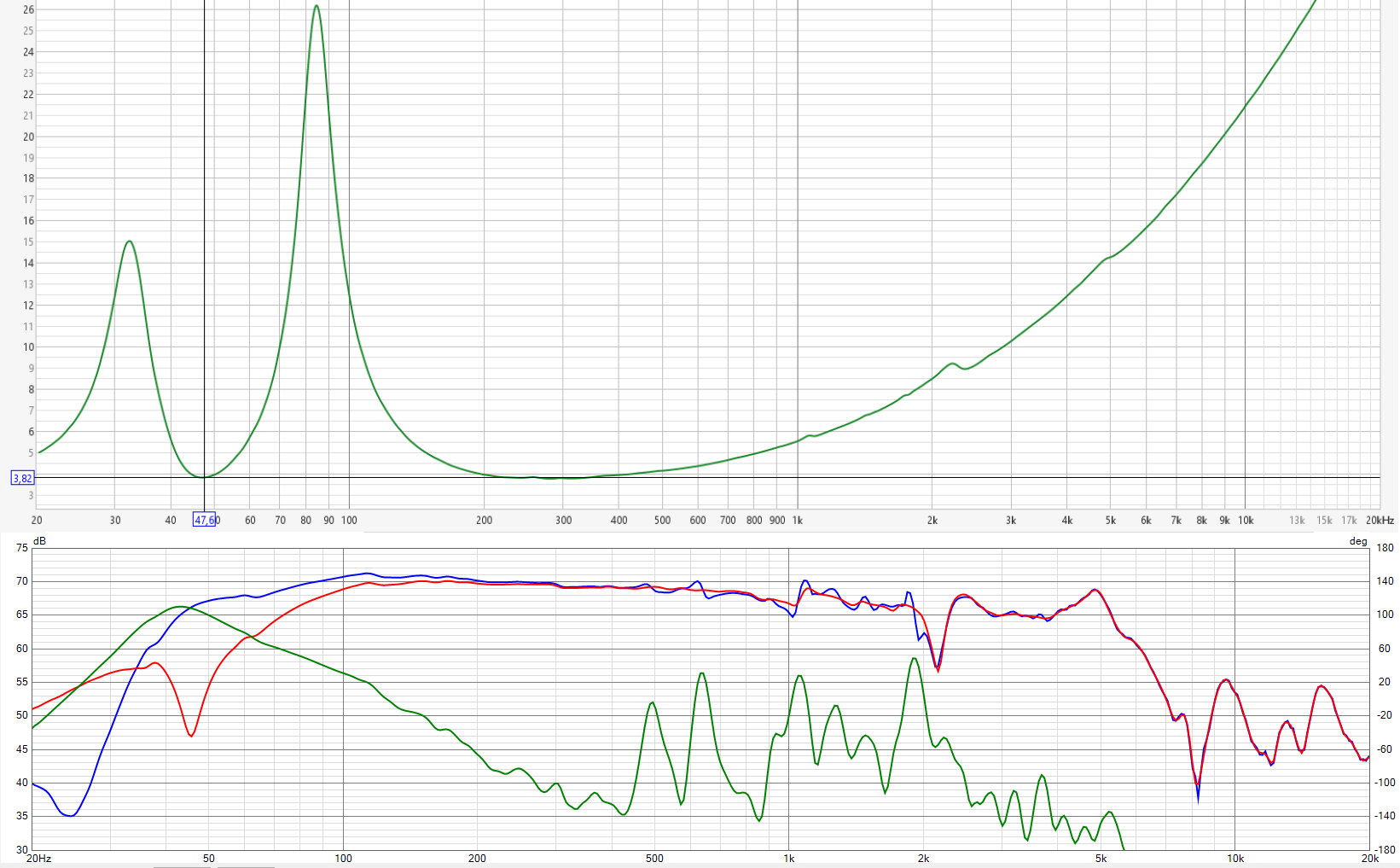 По импедансу видно, что настройка порта 47,6Гц а не 50,5Гц, потому как труба длиннее расчётной. Подрежу. В принципе, можно и не подрезать.