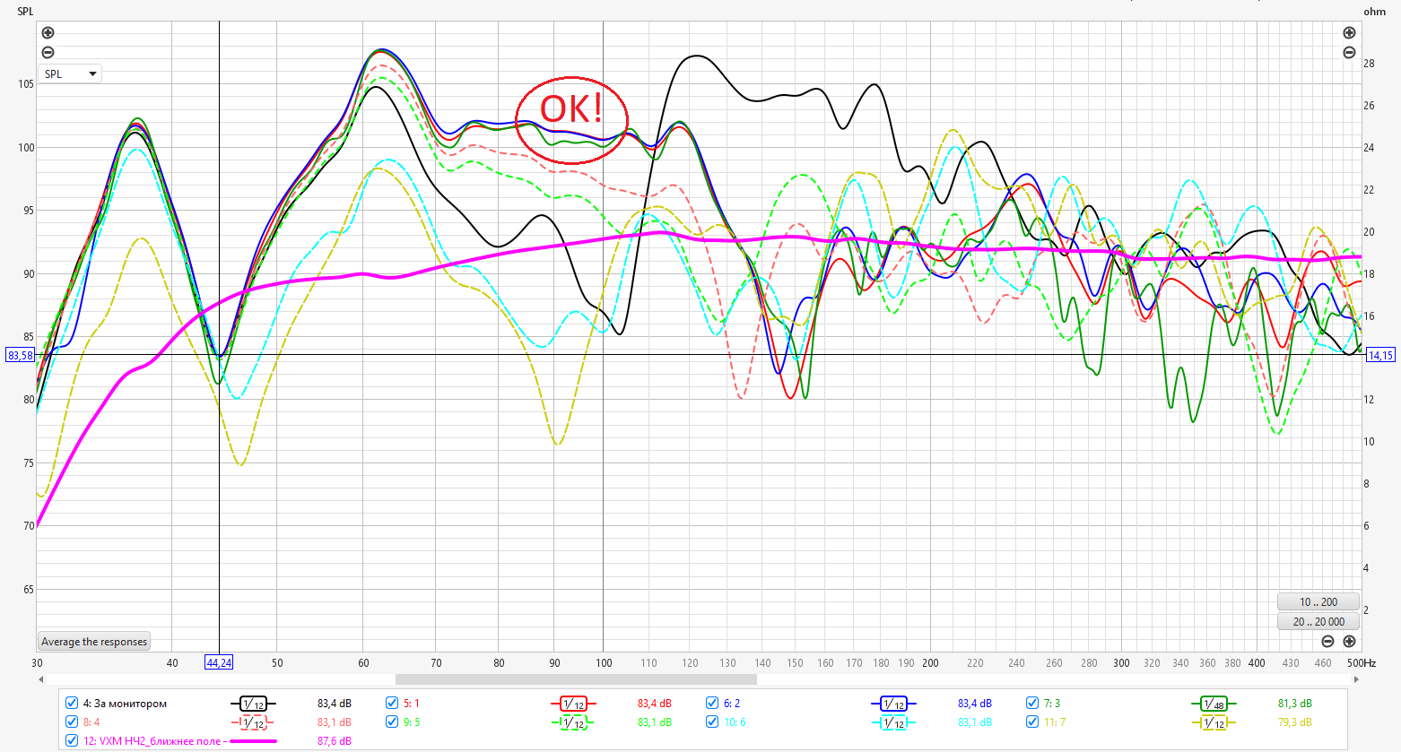 Пока всё сырое. Позже всё измерю с конкретными усилителями и с штатным размещением всех колонок. Из одной точки с одинаковой задержкой, для точных фаз.