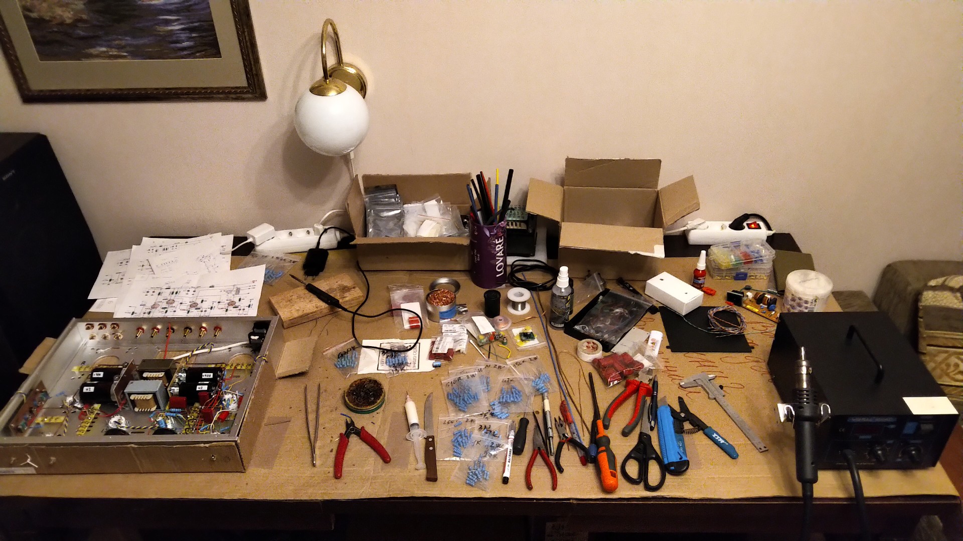Покажіть жінці як має виглядати стіл у гостиній, коли чоловік 3 місяці паяє ламповий підсилювач.